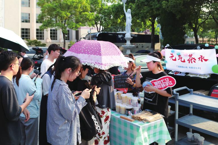 博鳌广场上,多辆小汽车组成的“后备箱集市”一字排开,各式养生饮品、清凉糕点、黄芪精、益生菌……一个个微缩版的商店,吸引员工结伴而来。丰富多彩的后备箱集市成了博鳌广场上一道靓丽的风景线。