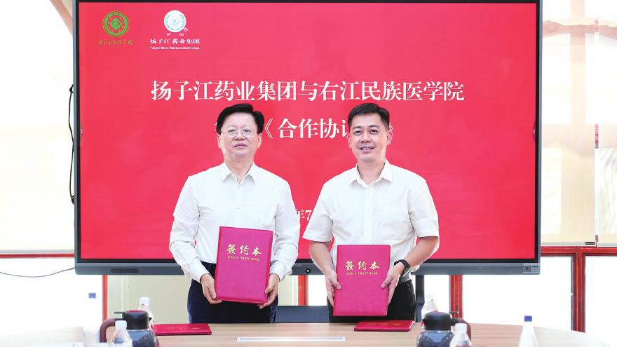 会上,封留才与黄龙坚共同签署《扬子江药业集团有限公司与右江民族医学院合作协议书》。(扬子江学堂 张昊田)