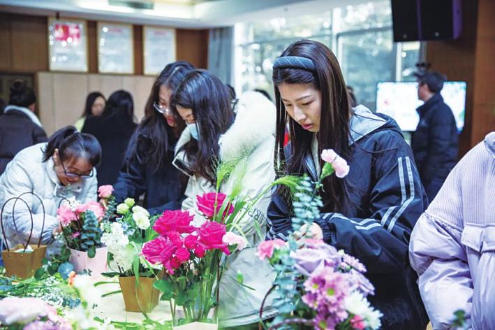在四川海蓉的花艺课上,大家在花艺师的指导下,为自己的插花修剪枝叶、搭配色彩、设计造型,构思出独一无二的花艺作品,拍照留念,定格美好瞬间。