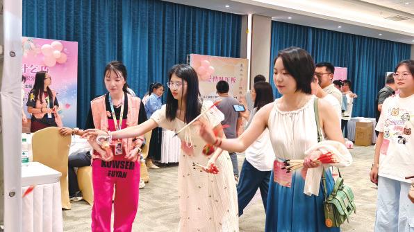 在穿珠乞巧环节,参与的员工精心挑选心仪的彩色珠子,用灵巧的双手编织出一条条独一无二的手链。在“投壶纳福”环节,员工们手执箭矢,轻盈躬身,精准投向彩壶,“投中了!”的欢呼声此起彼伏。“智取巧果”环节中,当参与者钓起巧果时,不仅是手眼协调的胜利,更被赋予吉祥如意的象征意义。