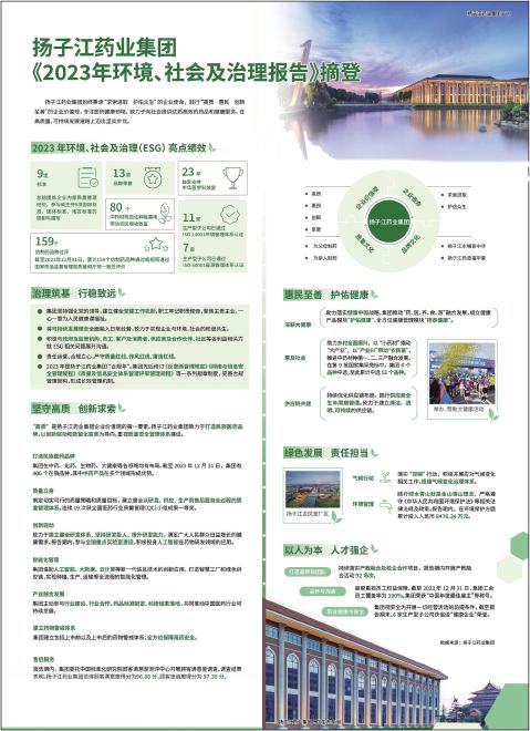 扬子江药业集团始终秉承“求索进取护佑众生”的企业使命,践行“高质惠民创新至善”的企业价值观,专注医药健康领域,致力于向社会提供优质高效的药品和健康服务,在高质量、可持续发展道路上迈出坚实步伐。