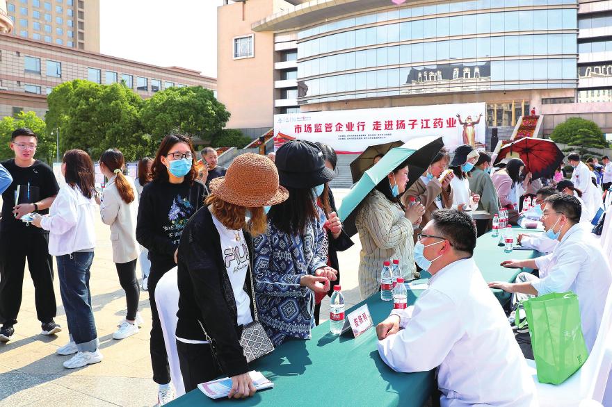 5月16日下午,泰州市市场监管局和市人民医院一同走进扬子江药业集团开展法治宣传和市场监管企业行活动。图为市人民医院在扬子江大礼堂广场开展义诊活动。(品牌宣传部供图)