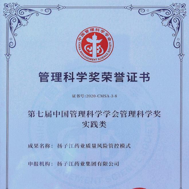 9月29日,经中国管理科学学会评选并公示,第七届中国管理科学奖获奖名单产生,其中,管理科学奖15项(学术类6项,实践类9项),管理科学奖专项奖30项(创新奖、英才奖、促进奖各10项),3人获管理科学奖特殊贡献崇敬奖。扬子江药业集团有限公司申报的“药品质量风险管控模式”荣获中国管理科学奖(实践类),也是医药行业唯一获此殊荣的企业。