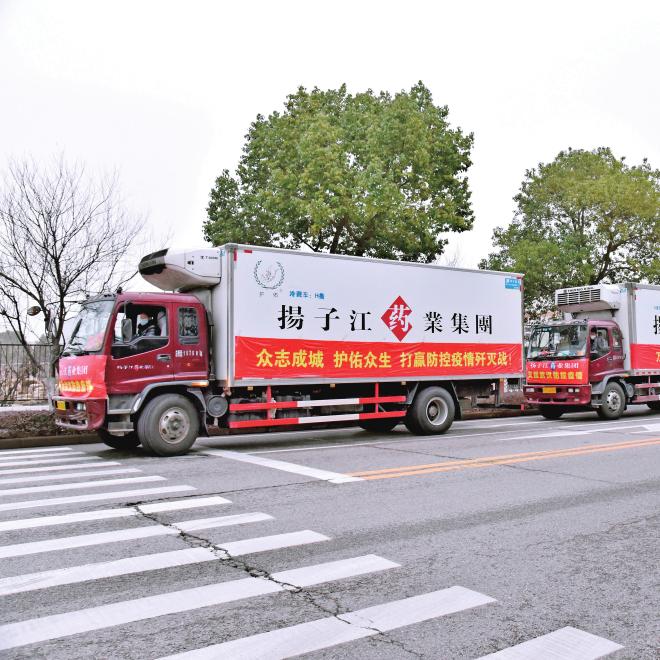 1月22日,腊月二十八夜,一辆辆大货车满载抗病毒药物,从扬子江药业总部出发,开赴疫情最严重的武汉市,全力支援武汉人民抗击新型冠状病毒。扬子江药业一方面派出车队连夜向武汉输送急需的抗病毒药品,一方面召集生产、质量一线负责人,开足马力,加班加点生产,全力以赴保障药品供应。