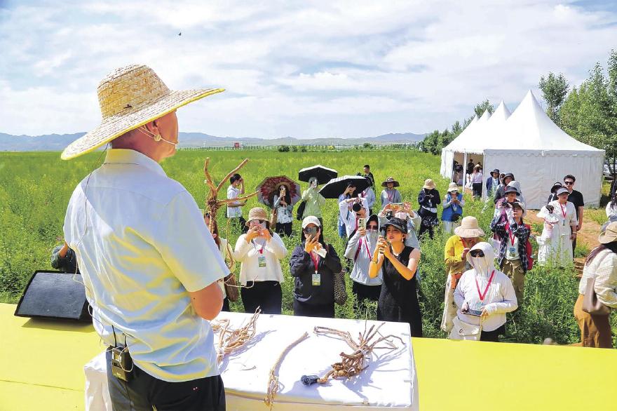 碧草连天,清风拂面,黄芪节现场,人们身处“云中草原”,探访道地药材产区——固阳县地处北纬41°黄金带,距包头城区50余公里。这里气候冷凉、日照充足,温差较大,有利于黄芪的生长。固阳黄芪色正、味甘、质密,通过农业农村部国家农产品地理标志认证,当地享有“中国固阳·正北黄芪之乡”美誉。