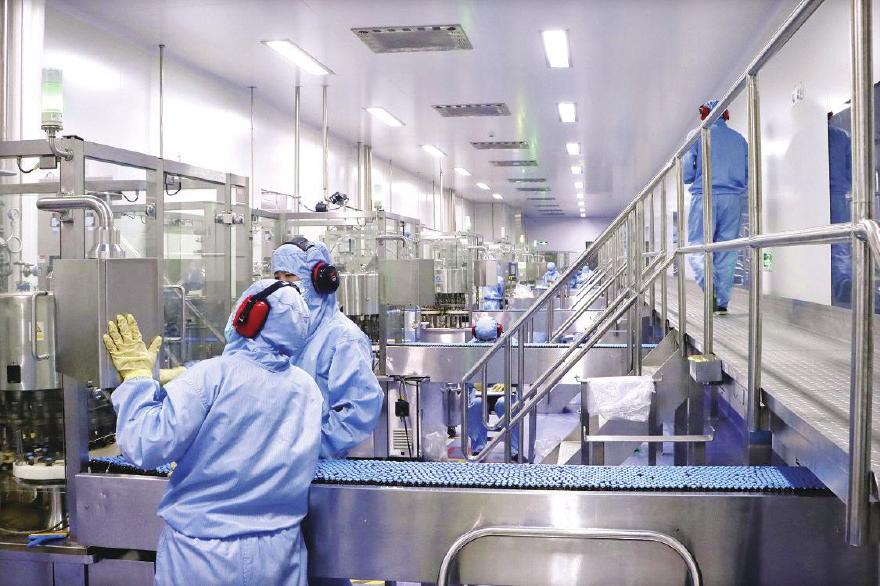 在有限公司工厂口服液2号车间,药品包装线上,身着蓝色工装的工作人员快速将从自动化生产线下来的一支支蓝芩口服液进行分装、码垛、入库。目前这里在做好疫情防控措施的同时,正开足马力24小时满负荷运转,员工接力倒班、轮班,放弃周末,在原日产能的基础上,每月可新增700多万支产量,最大限度地保障了市场供应,做到防疫生产“两手抓、两不误”,为打赢疫情防控歼灭战贡献力量。